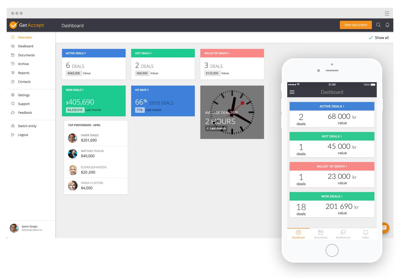 GetAccept ofrece una plataforma de ventas todo en uno que combina herramientas esenciales, ayudando así a los equipos comerciales a reducir el tiempo y esfuerzo invertido en las ventas.
