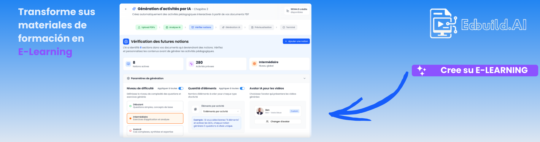 Con solo unos clics, importe un documento: la IA identifica los conceptos clave de su documento y luego genera: vídeos, preguntas de respuesta corta, preguntas de opción múltiple, tarjetas didácticas, glosario y muchas otras actividades de aprendizaje electrónico. Usted valida, edita o regenera cada actividad para mantener el control sobre la pedagogía y el tono de la marca. Todo es modificable (incluido el avatar para el vídeo, el guion y el contenido de las diapositivas de la presentación) para obtener un resultado acorde con su imagen.