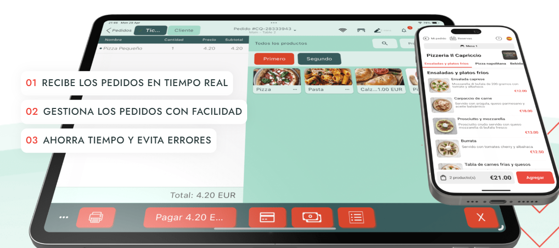 - Integración con sistemas de visualización de cocina (KDS) para una comunicación fluida